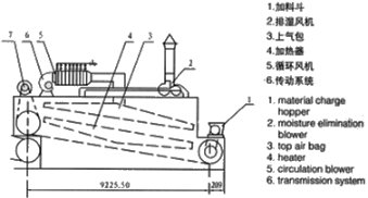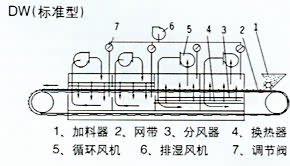 DWP型屬噴射氣流帶式干燥類型 ,熱風從狹縫流或孔束流向下或上下同時噴向輸送帶上的物料,由于噴射氣流高達15m/s以上,故對流傳熱的傳熱膜極薄,傳熱系數(shù)大,干燥速度快。該設備用于不透氣類物料時,上面噴射氣流仍返回上面,下面噴出的氣流仍返回下面,再參與循環(huán)。對透氣性物料氣流束具有強穿透性及在物料內(nèi)部的擴散性。使用熱源可以是蒸汽、電、熱風爐及燃油煙通氣等。