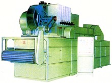 物料由加料器均勻地鋪在網(wǎng)帶上,網(wǎng)帶一般采用12-60目不銹鋼絲網(wǎng),由傳動裝置拖動在干燥機內(nèi)移動。干燥機由若干單元組成,每一單元熱風獨立循環(huán),部分尾氣由專門排濕風機排出,廢氣由調(diào)節(jié)閥控制,熱氣由下往上或由上往下穿過鋪滿物料的網(wǎng)帶完成熱量與質(zhì)量傳遞的進程,帶走物料水份。網(wǎng)帶緩慢移動,運行速度可根據(jù)物料溫度自由調(diào)節(jié),干燥后的成品連續(xù)落入收料器中。上下循環(huán)單元根據(jù)用戶需要可靈活配備,單元數(shù)量亦可根據(jù)需要選取。
